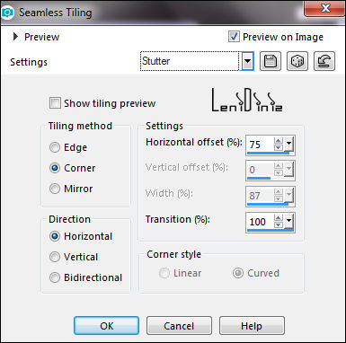 12- Layer > Duplicate. Fechar a visibilidade da layer Copy of Promoted Selection 1. Ativar a layer Promoted Selection 1. 13- Effects > Image Effects > Seamless Tiling: Default. 14- Ativar e abrir a visibilidade da layer Copy of Promoted Selection 1. Effects > Image Effects > Seamless Tiling > Stutter:
