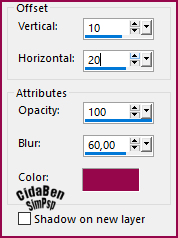 - Edit > Copy no Tube principal. Adjust > Sharpness > Sharpen. Posicionar o Tube à direita. Effects > 3D Effects > Drop Shadow à sua escolha ou nas as configurações abaixo: