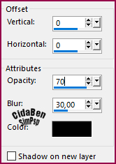 Selections > Invert. Effects > 3D Effects > Drop Shadow > 0 > 0 > 70 > 30 > Color: #000000 (Preto). Selections > Select None.