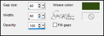 6 - Selections > Load/Save Selections > Load Selection from Disk: SelectionFest75_1ByXiki. Selections > Promote Selection to Layer. Selections > Select None. Effects > Texture Effects > Weave: Weave color: com a cor do Foreground