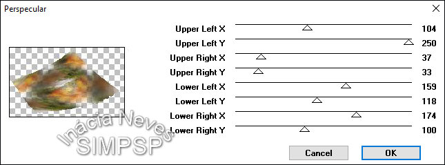 5 - Abrir a visibilidade e ativar a layer Copy of Raster 1; Effects > Plugin > Filter Factory Gallery L > Perspecular, como no print abaixo: