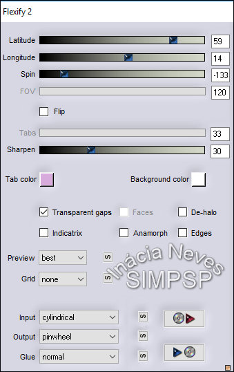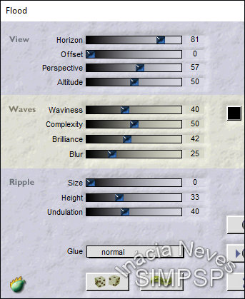 11 - Ativar a layer Merged; Effects > 3D > Drop Shadow > -10/10/100/30 Color Preto; Adjust > Sharpness > Sharpen More; Layers > Merge Down; Effects > Plugin > Flaming Pear > Flood, nas configurações já usadas no item 6; Abrir a visibilidade da layer Raster 1.