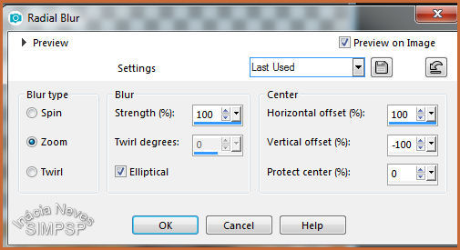 Layers > Duplicate Image > Mirror Horizontal Image > Flip Vertical Layers > Merge Down 9 - Layers > Duplicate. Ativar a Layer Raster 3. Adjust > Blur > Radial Blur: