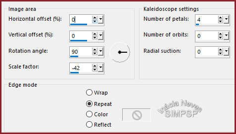 5- Layers > Duplicate: Ativar a Raster 2 Effects > Reflection Effects > Kaleidoscope: Effects > 3D Effects > Drop Shadow: Ativar a Layer Raster 2 Shadow 1. Layers > Properties > General > Blend Mode: Hue ou outro ao seu gosto 6- Ativar novamente a Raster 2 Effects > 3D Effects > Drop Shadow