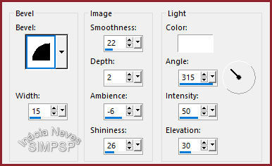 10- Selections > Select All. Image > Add Borders > 50 px > symmetric > #e9cbd1 (cor clara de uso) Selections > Select > Invert. Effects > 3D Effects > Drop Shadow: Effects > 3D Effects > Inner Bevel: Selections > Select None.