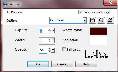 27- Image > Add Borders > Symmetric: 1 px color #440404 Foreground 3 px color #ecc7b7 Background 1 px color #440404 Foreground 28- Selections > select All. Image > Add Borders > Symmetric: 50 px with any color. Selections > Invert. 29- Edit > Paste into Selection. Adjust > Blur > Gaussian Blur:15 30- Effects > Texture Effects > Weave: Weave color #440404 (Foreground)