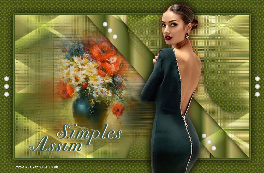 33- Edit > Copy no título_simples_assim_leni Edit > Paste as New Layer. Posicionar à sua escolha. Effects > 3D Effects > Drop Shadow à sua escolha. 34- Image > Add Bordes > 1px - Symmetric - color #404f16 (Background) 35- Assine ou coloque a sua marca d'água. File > Export > JPG Optimizer.