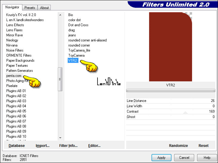 13- Effects > 3D Effects > Drop Shadow: 0 > 0 > 100 > 30, Color: #000000. Selections > Select None. 14- Layers > New Raster Layer. Selections > Load/Save Selections > Load Selection from Alpha Channel: leni #2 Pinta com a cor do Background (cor mais escura). 15- Effects > Plugins > Filters Unlimited > Penta.com > VTR2: