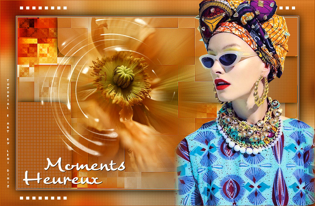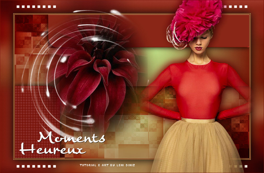33- Edit > Copy no decor_heureux_leni_2 Edit > Paste as New Layer. Ferramenta Pick Tool: Position X 70 - Position Y 50 Nota: Você pode posicionar sobre o misted que escolheu para que ambos fiquem posicionados em harmonia. 34- Edit > Copy no titulo_moments_heureux_leni. Edit > Paste as New Layer. Posicionar à sua escolha. Effects > 3D Effects > Drop Shadow à sua escolha. 35- Image > Add Borders > 1px - symmetric - color #751102 (Background cor escura) 36- Assine ou aplique a sua marca d'água. File > Export > JPG Optimizer.