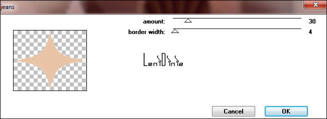 11- Layers > New Raster Layer. Selections > Load/Save Selections > Load Selection from Alpha Channel: leni #1 Pintar com a cor do background (cor clara). 12- Effects > Plugins > penta.com > jeans: