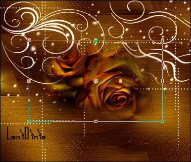 19- Layers > Properties > General > Blend Mode: Luminance (L) > Opacity 100. 20- Edit > Copy no Misted_flora_30_leni Image > Resize se for necessário, no misted do material o Resize foi de 50%. Posicionar um pouco mais para a esquerda como no exemplo: 21- Adjust > Sharpness > Sharpen. 22- Edit > Copy Special > Copy Merged. 23- Image > Add Bordes: 1px - symmetric - color: #5c2401 (cor Foreground). 3px - symmetric - color: #e1ba03 (cor Background). 1px - symmetric - color: #5c2401 (cor Foreground). 24- Selections > Select All. Image > Add Bordes > 50px - symmetric qualquer cor. Selections > Invert. Edit > Paste into Selection.