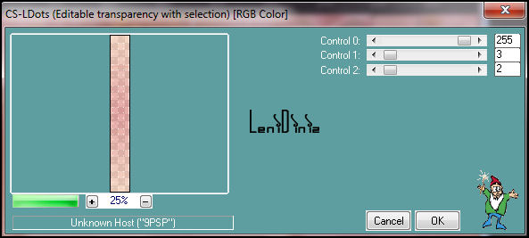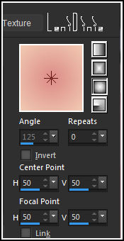 15- Pintar a seleção com um gradiente Sunburst, formado pelas cores 1 e 2. Repeats: 0 - Center Point e Focal Point: H 50 V 50 "Vai ficar com baixa opacidade ao pintar" 16- Layers > Duplicate. Layers > Merge > Merge Down. 17- Effects > Plugins > Caroline and Sensibility > CS Dots: Selections > Select None. 18- Ativar a cópia do decor_mae_leni-3, Edit > Copy. No Trabalho... Edit > Paste as New Layer.