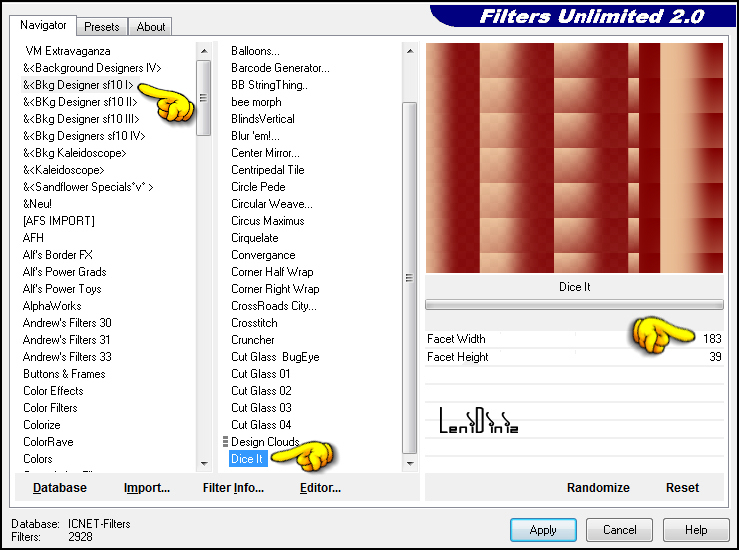 04- Effects > Plugins > Filters Unlimited > Bkg sf10 I > Dice It: