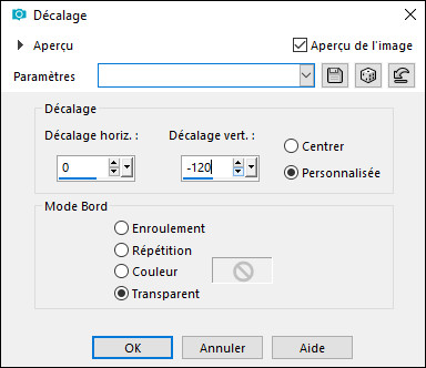 - 34 - Effets > Effets d'image > Décalage: Décalage horiz.: -295 - Décalage vert.: 0, Personnalisée, Transparent.