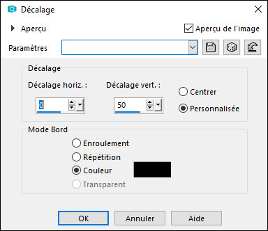 Effets > Effets d'image > Décalage: Décalage horiz.: 0 - Décalage vert.: 50, Personnalisée, Couleur.