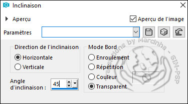 - 13 - Calques > Dupliquer. Effets > Effets géométriques > Inclinasion: Horizontale / 45 / Transparent