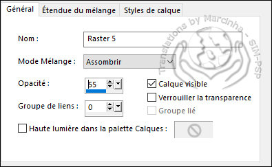 - 22 - Calques > Propriétés > Général > Mode Mélange: Assombrir - Opacity: 55%