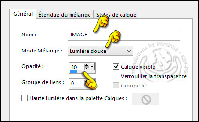 Réglage > Netteté > Netteté. Calques > Nouveau calque raster. Édition > Copier en Tube Principale ou misted décoratif. Édition > Coller dans la sélection. Calques > Propriétés > Général: Nom: IMAGE - Mode Mélange: Lumière douce - Opacité: 30%