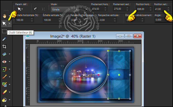 -- 19 -- Calques > Dupliquer. Activer le calque "Copie de Raster 1". Image > Redimensionner: 70% - décocher "Redimensionner tous les calques".