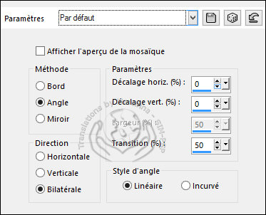 -- 03 -- Édition > Copier le Image. Édition > Coller dans la sélection. Sélections > Ne rien sélectionner. Effets > Effets d'image > Mosaique sans jointunres: Par défaut.