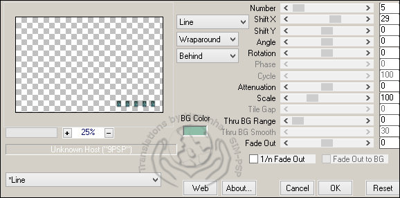 -- 19 -- Calques > Dupliquer. Image > Redimensionner: 10% - décocher "Redimensionner tous les calques". Outil Sélecteur: Position horiz: 583,00 et Position vert: 482,00 Effets > Modules externes Mura's Meister > Copies.