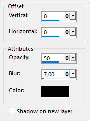 7 - Selections > Select None. Layers > Merge > Merge Down. Effects > 3D Effects > Drop Shadow: 0 / 0 / 50 / 7, color #000000