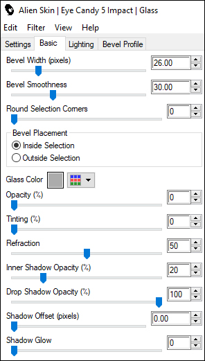 29 - Effects > Plugins > Alien Skin > Eye Candy 5 Impact > Glass: Settings: Clear