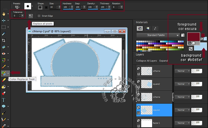 5- Com a Color Replacer Tool configurada como print abaixo clique na layer sqaure1, e pinte clicando em Replace all pixels. Depois clique sobre a layer sqaure2 e clique novamente em Replace all pixels.