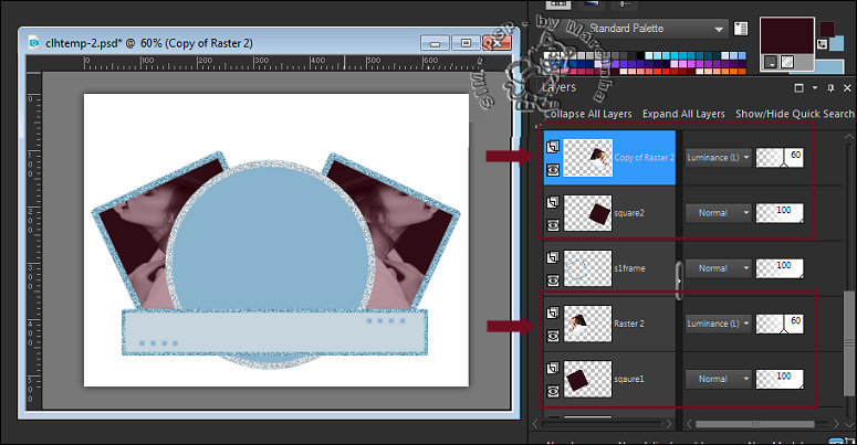 20- Volte na imagem do template q estamos trabalho e Edit Paste New Layer, ajustando a imagem do tube para que a mesma fique entre as layers "cframe" e "rec".