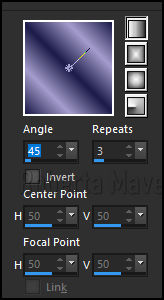 2 - Abra uma imagem transparente de 900 x 600 px. Pinte com o gradiente formado pelas cores escolhidas: Linear - Angle: 45 - Repeats: 3 - Invert: Desmarcado