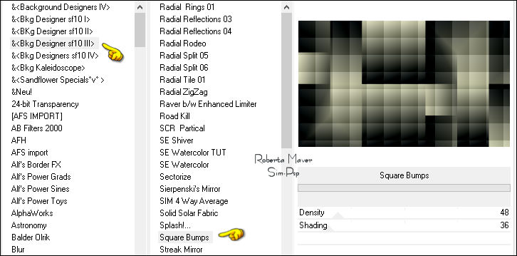 4 - Effects > Plugins > Filters Unlimited 2.0 > Bkg Designer sf 10III > Square Bumps: