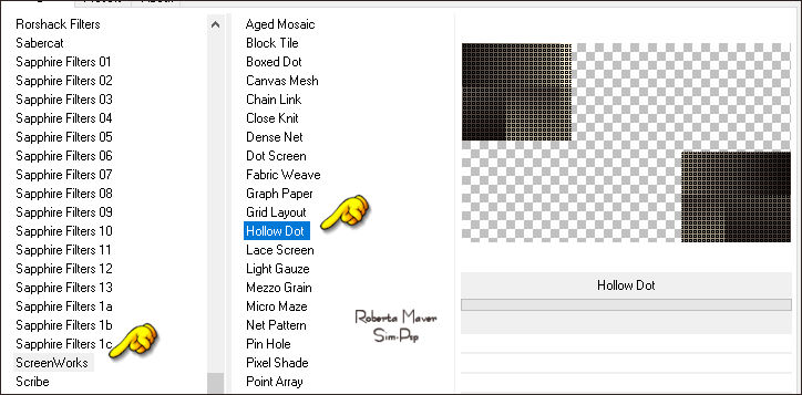16 - Effects > Plugins > Filters Unlimited 2.0 > ScreenWorks > Hollow Dot. Selections > Invert. Effects > 3D Effects > Drop Shadow: 0, 0, 100,50, Color: #000000 Selections > Select None.