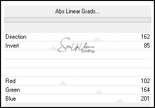 12 - Layers > Duplicate. Effects > Plugins > Filters Unlimited 2.0 > Alf's Power Grads > Abs Linear Grads: