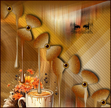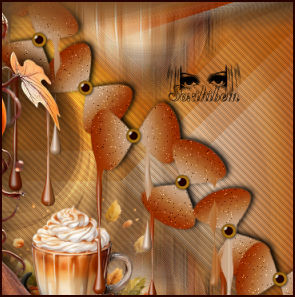 21 - Ative a layer Promoted Selection. Edit > Copy no 126DiversosByPqnaAlice ou Misted ou tube tema Halloween. Edit > Paste a New Layer. Image > Resize se necessário, no tube do material foi de 30%. Image > Mirror > Mirror Horizontal. Adjust > Sharpness > Sharpen. Aplique Drop Shadow como preferir. Posicione como no print, dando a impressão que o efeito Drip esta caindo na xícara. * Uma parte da imagem ficou abaixo do efeito da layer Copy of Raster 1,deixe assim para dar um ar meio de mistério.