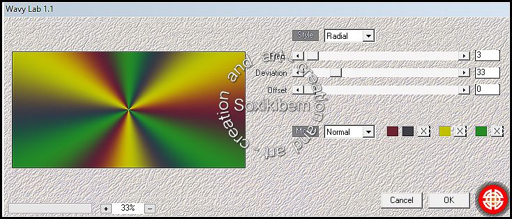 3 – Abra uma transparência de 1000x500px. 4 – Deixe ela transparente e aplique o Plugin Mehdi>Wavy Lab 1.1. Veja no print que eu coloquei as cores que tinha escolhido.