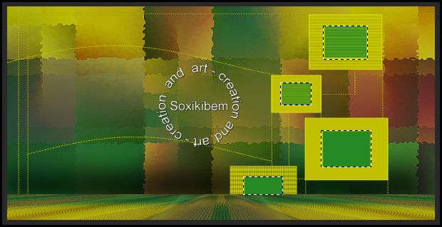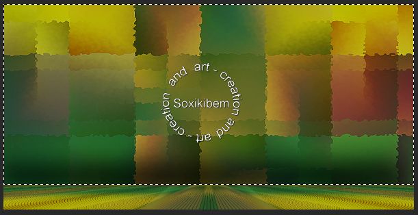 18 – Pinte esta seleção com uma das cores em uso. 19 – Mantenha a seleção e aplique a mask Monaiekje mask 9. Merge Group. Select None. 20 – Effects > Edge Effects > Enhance. 21 – Adicione uma nova Layer. Layers > Arrange > Move down. 22 – Com a ferramenta Selection, Selection type: Rectangle, Mode: Add (shift), selecione o centro de cada um dos quadrados da mask. Pinte com uma das cores em uso. Select None.