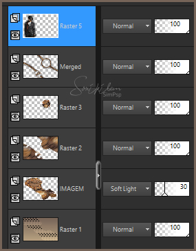 Adjust > Sharpness > Sharpen. Layers > New Raster Layer. Copy on tube or misted. Edit > Paste Into Selection. Layers > Properties > General > Blend Mode: Soft Light / Opacity: 30%. Name this layer IMAGE. Selection > Select None.