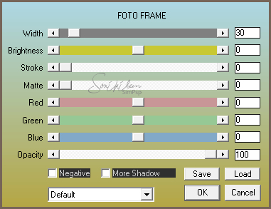 31 - Selections > Select All. Selections > Modify > Contract Selection: 50. Press the Delete key on the keyboard. Selections > Invert. Layers > Merge > Merge Down. Effects > Plugin AAA Frames > Foto Frame.
