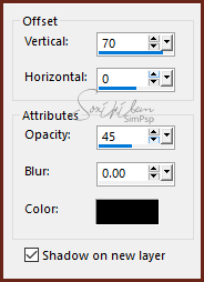 27 - Effects > 3D Effects > Drop Shadow como no print abaixo. Shadow on new layer marcado. Com a cor preta.