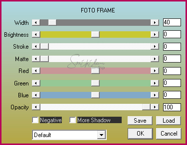 15 - Image > Add Borders: 5px na cor foreground Selections > Select All. Image > Add Borders: 40px na cor background. Selections > Invert. Effects > Plugin AAA Frames > Foto Frame: with 20. Selections > Select None.