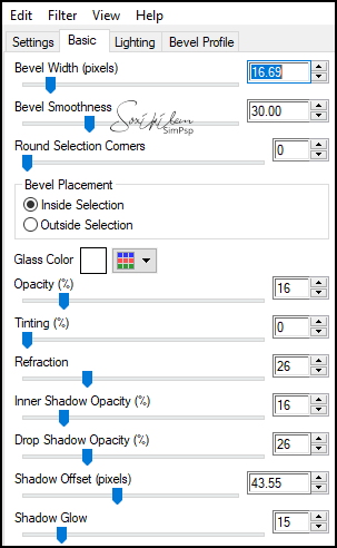24 - Layers > New Raster Layer. Pintar a seleção com a cor 3 (branco). Selections > Modify > Contract: 10. Aperte a tecla Delete do teclado. Plugin Alien Skin Eye Candy 5 Impact > Glass.