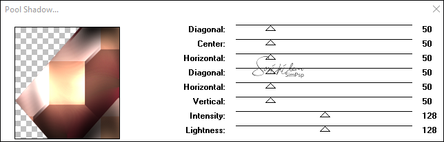 Layers > New Raster Layer. Pintar com o gradiente em uso. Effects > 3D Effects > Drop Shadow: 0, -9, 45, 20, cor preta. Selections > Select None. Plugins > Tramages > Pool Shadow: Default.