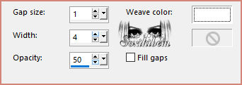15 - Ativar a Layer Raster 1. Selections > Load/Save Selections > Load Selection From Disk: WhisperingPetals_Xiki4. Selections > Promote Selection to Layer. Effects > Texture Effects > Weave, com a cor 3: #ffffff Selections > Select None. Layers > Properties > General > Blend Mode: Hard light.