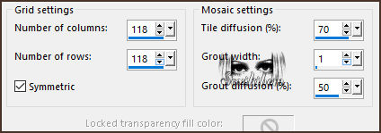 19 - Effects > Texture Effects > Mosaic - Antique. Em versões anteriores ao PSP 22, a configuração do Grid settings vai apenas até 100, então aplique a numeração 100 em Number of columns e rows.