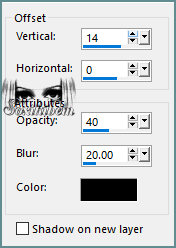 20 - Effects > 3D Effects > Drop Shadow: color: #000000 Repita o Drop Shadow mudando em Vertical para -14. Selections > Select None.