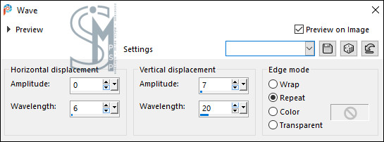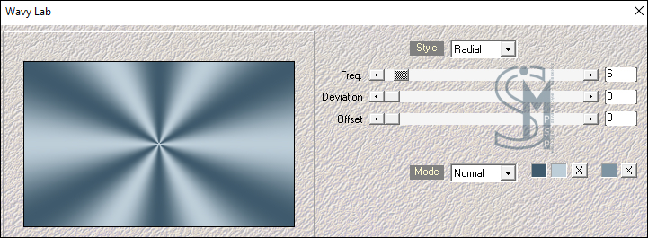 02 - Abra uma imagem transparente de 900x550px. Effects > Plugins > Mehdi > Wavy Lab: Ordem das cores: Foreground / Background e Mantenha a última cor criada pelo filtro.