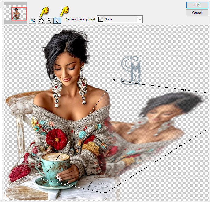 Clicando na "mãozinha" mova o tube para a esquerda e clicando na "setinha" ajuste o tamanho da sombra e a posição conforme seu tube: