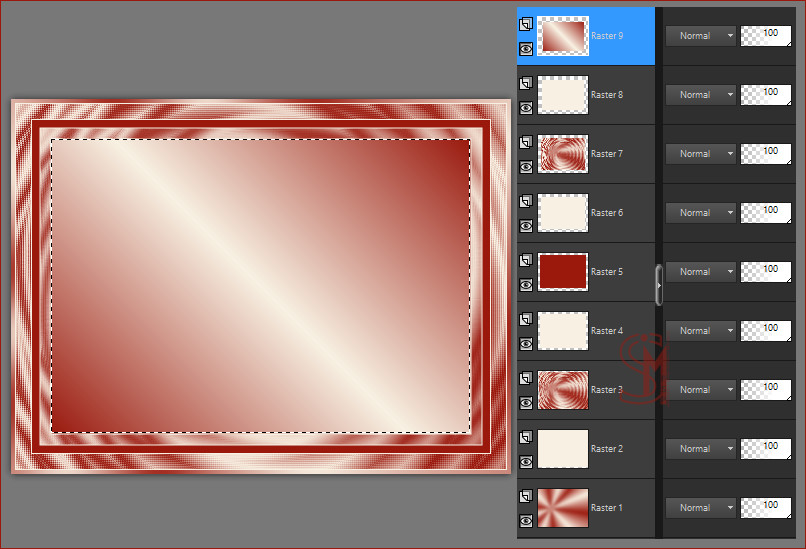 Selections > Modify > Contract: 2 Layers > New Raster Layer. Preencha com a cor escura do Background. Selections > Modify > Contract: 15