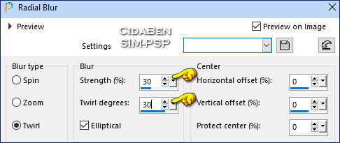 px > Symmetric marcado > com qualquer cor. Adjust > Blur > Radial Blur.