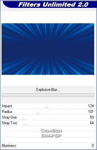 8 - Ativar a Layer Raster 1. Layers > Arrange > Bring to Top. Effects > Plugins > Filters Unilimted 2.0 > Déformation > Explosive Blur.